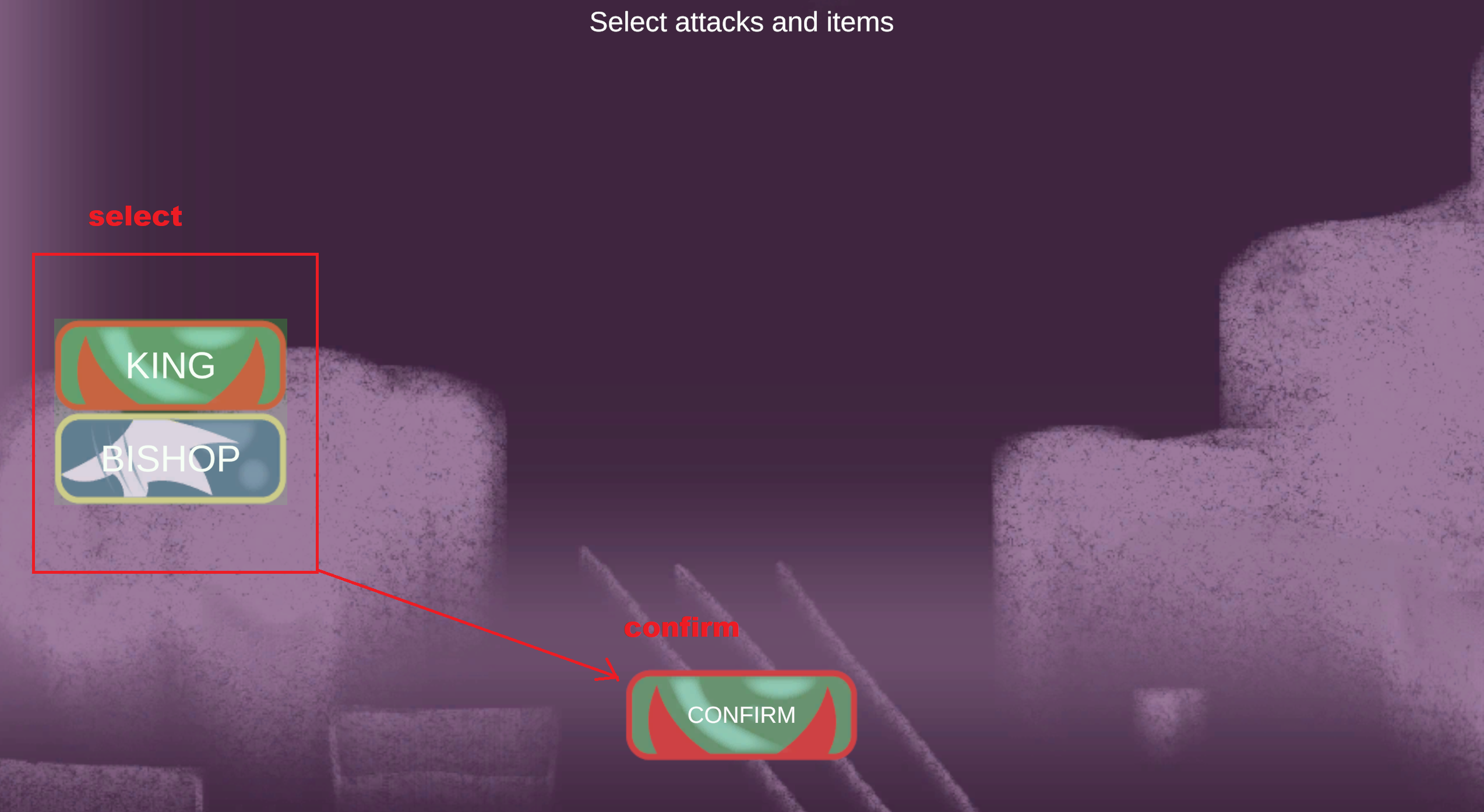3. Defeat all enemies. After you've done that, ability selector will show up. You must choose 2 attacks and up to 2 items to proceed (if you have them unlocked). Click on the desired abilities and press confirm. You can deselect an ability by pressing on it again